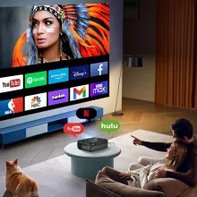 Transform your living room into a cinematic experience with our 1080p Full HD Portable Projector. Designed for modern entertainment enthusiasts, this mini projector delivers stunning visuals and seamless connectivity, making it a perfect addition to any home. Whether you’re watching your favorite movies, streaming shows, or gaming, this projector ensures an immersive experience with its advanced features and superior image quality. Featuring a powerful Android 9.0 OS, this projector allows you to enjoy a wide range of apps from its built-in app store. No more worrying about outdated software; download and update the latest apps anytime. With the AI intelligent push feature, you’ll never run out of great content to watch, as it recommends high-rated movies tailored to your preferences.