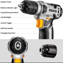 - 8V cordless drill with 3/8″ keyless chuck for fast bit changes