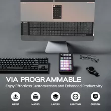 Its durable PC plate, compact 3.6 x 5.4 x 1.1 in. body, and ultra-light 0.44 lb frame make it a powerful yet portable companion. Dynamic RGB lighting adds visual flair, while NKRO support ensures zero missed key presses under pressure. A long-lasting 1000mAh battery keeps you productive all day, and full VIA programmability gives you total control of macros, remapping, and customization.