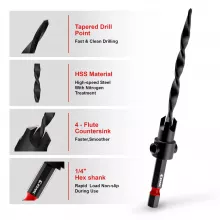 From hardwood furniture to delicate cabinetry, this kit provides the tools you need to achieve flawless results every time. Each piece is crafted from industrial-grade High-Speed Steel (HSS) with a titanium nitride coating, ensuring enhanced hardness, wear resistance, and a long-lasting sharp edge. The 82-degree countersink angle and self-centering pilot tip make smooth, splinter-free drilling effortless.