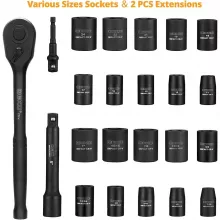 This complete socket set includes 20 impact sockets in both SAE and metric sizes, plus extension bars, a drill adapter, and a quick-release ratchet handle. Each socket is laser-etched with high-visibility markings for fast size identification, while the sturdy, custom case keeps everything neatly organized and ready to go when you need it.