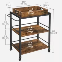 This serving cart includes three spacious tiers, giving you plenty of room for snacks, dishes, appliances, or bar essentials. Its removable top tray makes serving effortless—prepare drinks or appetizers on the cart, then lift the tray and carry it wherever you need. With smooth-gliding wheels and two built-in brakes, you can move the cart around freely or lock it securely in place. Leveling feet are also included, ensuring the cart stays steady on uneven floors when the wheels are removed.