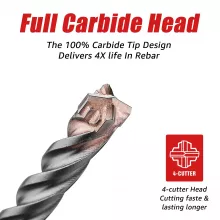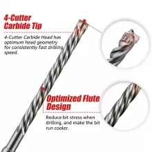 The standout feature is the 4-cutter carbide tip. Unlike standard designs, it spreads impact evenly and powers through embedded steel without jamming. That means smoother drilling, less vibration, and fewer interruptions. The deep U-shaped flutes quickly clear dust from the hole, reducing friction and heat while improving drilling speed. The result is a cooler-running bit that lasts longer and performs consistently from the first hole to the last.