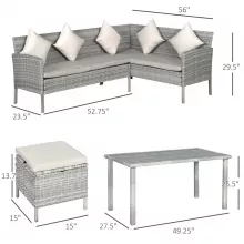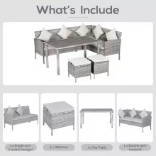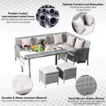 - Modular Design: Includes two loveseats that combine to form a spacious L-shaped sectional sofa, two versatile stools/ottomans, and a stylish dining table.