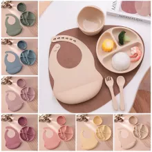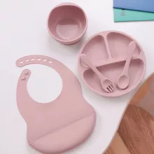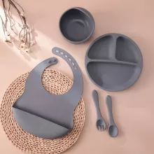 - 5-piece complete set including suction bowl, suction plate, bib, spoon, and fork.