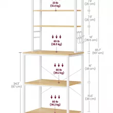 This rack features six spacious shelves crafted from durable particleboard supported by a strong steel frame. The middle worktop holds up to 85 lb, making it perfect for a microwave, espresso machine, or other larger appliances. Upper shelves support 23 lb each—ideal for spices, décor, or small essentials—while the lower shelves hold up to 80 lb each to store heavier cookware or bags of ingredients.