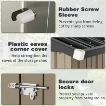 From the moment I set my eyes on this outdoor metal storage shed, I knew it was exactly what my backyard. The elegant brown finish is not only pleasing to the eye but also adds a touch of sophistication to my garden area. But this shed isn't just about looks; it's functional practical too. The smart design truly sets it apart. The sloped provides additional overhead space, allowing me to store more items without feeling cramped – an aspect that came as a pleasant surprise during assembly! Speaking of which, setting up was a breeze thanks to the detailed instructions provided. Moreover, its multipurpose utility is impressive! It caters perfectly for various storage needs - from gardening tools to pet housing – making it an essential addition for any homeowner like myself who values organization and efficiency. What gives me peace of mind is knowing that my belongings are safe inside due to its lockable door feature. Plus, made with galvanized steel means no rusting or UV damage worries even in harsh weather conditions. In conclusion, every element of this tool house screams durability and style while offering ample room for storage — definitely worth investing in!