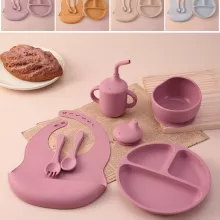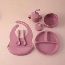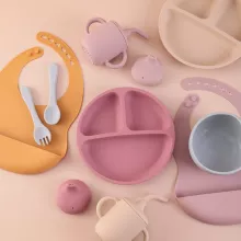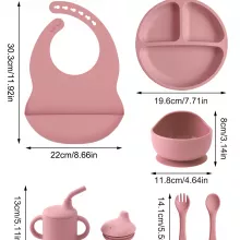 This complete dinnerware set features a suction plate, straw cup, fork, spoon, bib, and self-training utensils. The strong suction base keeps plates in place, preventing spills and reducing clean-up time. The soft straw cup encourages independent drinking while the silicone bib with deep pocket catches crumbs and drips.