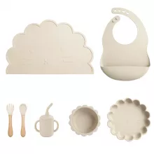 - 7 essential pieces including plate, bowl, bib, cup, and spoon