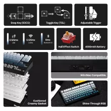 This keyboard combines comfort, customization, and cutting-edge responsiveness. The gasket-mounted structure creates a soft, cushioned feel with a creamy acoustic profile, enhanced by multiple layers of sound-dampening material. Shine-through PBT keycaps paired with dynamic RGB and underglow lighting bring vibrant clarity, while adjustable actuation lets you fine-tune every key from 0.1mm to 3.3mm. With tri-mode connectivity and long-lasting power, it’s ready for any setup—desktop, laptop, tablet, or phone.