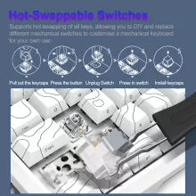 Enjoy vibrant RGB backlighting with up to 20 preset modes, adjustable brightness, and flowing effects that make every session feel personalized. Hot-swappable switches allow quick customization, giving you the freedom to swap switch types whenever you want a different typing feel. A built-in rechargeable battery keeps you powered longer, while the detachable cable adds convenience and portability.