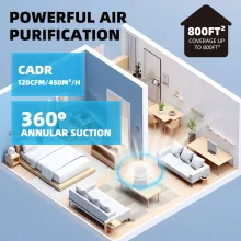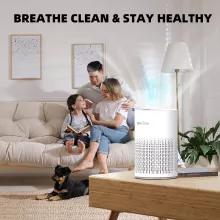 Featuring a 360° air intake and multi-layer filtration system, this purifier traps up to 99.97% of particles as small as 0.3 microns. From pet dander and hair to smoke, allergens, cooking fumes, and dust, you can count on cleaner air throughout your home. Its wide coverage area of up to 800 ft² ensures every corner benefits from purer air.