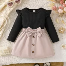 Dress your baby girl in a delightful blend of comfort and charm with this adorable autumn dress. Designed in a striking black and pink combination, this dress features ruffle edges and a sweet bow tie that bring a touch of elegance to her everyday wardrobe. With a cinched waist and full-length sleeves, it ensures a snug yet stylish fit, perfect for the cooler autumn months. Whether she’s attending a family gathering, a party, or simply enjoying a day out, this dress guarantees she’ll be the center of attention.