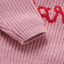 This long-sleeve sweater is crafted for cooler days. With its classic O-neck collar and simple pullover style, dressing your child becomes quick and fuss-free. The sweater fits true to size, offering a relaxed yet snug feel. It comes in multiple sizes suitable for ages 6 months to 3 years, ensuring a perfect fit as your child grows. The embroidered lettering adds a playful touch that makes this piece stand out from ordinary baby sweaters.