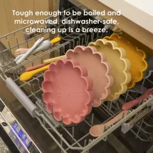 This feeding set is made from flexible, durable silicone that is latex-free, BPA-free, PVC-free, phthalate-free, and nitrosamine-free, giving parents complete peace of mind. The strong suction base keeps the bowl in place, helping to reduce spills and keep food where it belongs. Its smooth, gentle spoon is perfect for sensitive gums, while the plate and bowl offer enough depth for hearty portions as your child grows.