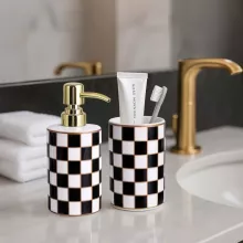 Black & White Checkered Ceramic Soap Dispenser & Bathroom Organizer Set