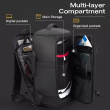 The backpack features a spacious main compartment with room for clothing, essentials, and personal items, plus a dedicated laptop section that safely fits most laptops up to 15.6 inches. Multiple interior pockets keep your phone, cables, and valuables easy to find, while the separate shoe compartment helps keep your clothes clean and organized.