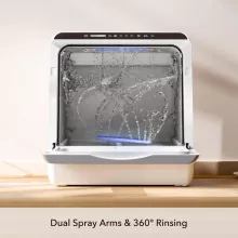 This dishwasher fits like a glove on my kitchen counter right next to the sink. Setting it up was a breeze, and using it is just as easy. I usually give my dishes a quick rinse before popping them in and hitting the speed wash setting. Even when I pack it full, everything comes out sparkling clean. I'm all about the sensor light and how well the drying function works, except I still end up washing pots and pans by hand since it's just my partner and me. The only real gripes I have are pretty minor. For starters, if I try to fill the water tank using the spray feature on my faucet, I can't hear the beep that tells me it's full because of the noise, so I stick to filling it with the pitcher they provided. Also, the power button flashes when the dishwasher isn't running, which kinda bugs me, so I just unplug it once it's done. And, the cup rack isn't big enough for regular-sized mugs, but it's no big deal—I use it for other stuff like utensils and small bowls instead. Overall, despite these small issues, I'm really happy with it. It's made a huge difference in my kitchen routine, keeping my counters clear and my sink empty.
