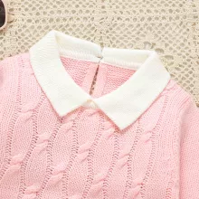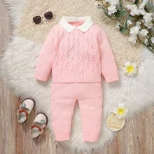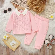 Crafted from soft acrylic yarn with a smooth worsted texture, the set feels gentle against delicate skin while keeping your child warm without bulk. The long-sleeve pullover features a sweet turn-down collar that adds a touch of classic style, while the pull-on trousers offer easy dressing and all-day comfort. With its solid pink design and knit construction, this outfit keeps your little girl stylish whether she’s playing indoors, enjoying a family outing, or posing for adorable photos.
