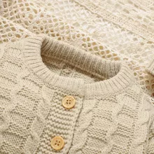 This charming set brings together everything parents love: comfort, cuteness, and practicality. Its solid-color knit pattern gives it a classic handmade look that’s perfect for everyday wear, family photos, or special outings. The full-sleeve cardigan features a single-breasted closure for quick dressing, while the sleeveless romper allows your baby to stay comfy during warmer indoor moments.