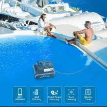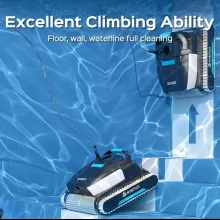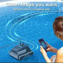 Our pool cleaner stands out with its unique blend of technology and convenience. It’s equipped with three powerful motors, ensuring thorough cleaning and efficient operation. The 18m floating cable provides extensive reach, making it perfect for various pool sizes. Moreover, its wall-climbing capability ensures that every inch of your pool, from floor to waterline, is impeccably clean. The simple structure and top access to filter baskets add to the ease of use and maintenance. Additionally, the APP control feature offers convenience at your fingertips, allowing you to manage your pool cleaning remotely.
