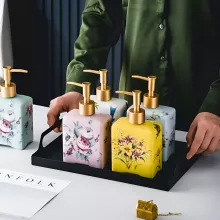Designed for those who appreciate fine craftsmanship and refined décor, this ceramic bottle brings a touch of tranquility to your bathroom or spa setting. Whether used during your morning routine or an evening bath, it enhances the atmosphere with its soft colors and nature-inspired artistry. The smooth ceramic material keeps your liquids fresh and hygienic while the pump dispenses effortlessly with each press.