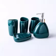 Bring timeless European elegance into your home with this Dark Green Ceramic Bathroom Accessory Set. Designed to add a touch of sophistication to your vanity or guest bathroom, this five-piece collection combines modern charm with classic craftsmanship. Each piece is beautifully finished in deep forest green tones, giving your space a calm, spa-like atmosphere that feels both stylish and serene.