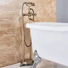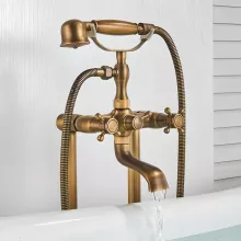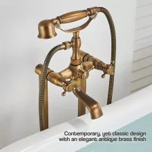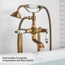 Introducing the pinnacle of bathroom luxury and design – our Dual-Handle Bathroom Floor Mount Bathtub Filler. Crafted for those who appreciate the finer details, this freestanding faucet with an antique brass finish promises to elevate your bathroom’s aesthetic and your daily ritual. The rotating spout and handheld shower head blend convenience with timeless style, ensuring a bathing experience that is as relaxing as it is refined.