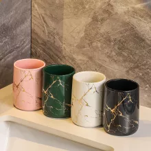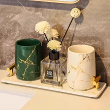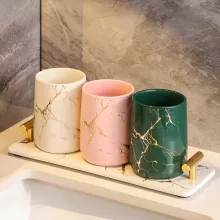 Transform your bathroom into a modern sanctuary with this Gold-Plated Marble Ceramic Mouthwash Cup and Toothbrush Holder Set. Designed with elegance and practicality in mind, this accessory set adds a refined touch to your sink space while keeping it beautifully organized. The smooth ceramic body, enhanced with subtle marble veining and gold-plated accents, reflects understated luxury that complements any bathroom décor—from classic to contemporary.