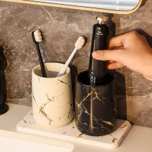 Unlike ordinary plastic holders, this gold-plated ceramic set combines style, durability, and sophistication. Its striped marble pattern is unique to each piece—no two are identical—giving your bathroom a one-of-a-kind touch. With this cup and holder, you’re not just organizing your essentials—you’re adding a piece of art to your everyday routine.