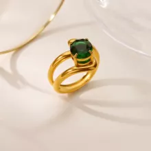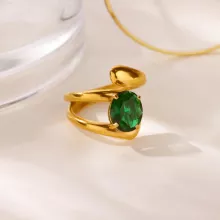 This stylish ring is crafted from durable stainless steel and finished with luxurious 18K gold plating. The dazzling green zircon sits securely in a bezel setting, providing both beauty and protection. Its geometric shape adds a chic, trending aesthetic that pairs perfectly with modern fashion. With a smooth, comfortable band and a gem size that gives just the right amount of sparkle, this ring is perfect for both special occasions and everyday wear.