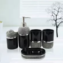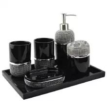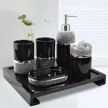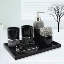 This six-piece set includes everything you need for a neat and polished bathroom: a lotion or soap dispenser, a mouth rinse cup, a toothbrush holder, a soap dish, and a coordinating tray to keep it all beautifully organized. Each item is thoughtfully crafted to complement one another, creating a cohesive, luxurious display on your countertop or vanity.