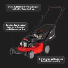 Transform your lawn care routine with our high-powered 21-inch Gas Push Lawn Mower. Boasting a robust 140cc OHV engine, this mower simplifies your yard work with its reliable recoil start and auto choke system, eliminating the hassle of priming and choke adjustments. Perfect for small to medium-sized yards (1/8 to 1/4 acre), it ensures a flawless cut with fewer passes, saving you time and energy.
