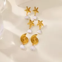 Elevate your summer style with these stunning Gold Conch Pearl Starfish Drop Earrings—a perfect blend of seaside charm and modern elegance. Designed for women who love jewelry that feels both expressive and effortless, these earrings feature a beautifully spiral-textured conch design paired with a smooth pearl drop for a touch of ocean-inspired grace. Their warm gold-color plating brings a radiant glow that flatters every skin tone, making them a must-have accessory for vacations, weekend getaways, and everyday wear.