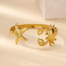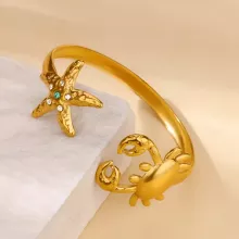 Crafted from high-quality stainless steel, this bangle is durable, comfortable, and resistant to tarnish, making it ideal for all-day wear. The beautifully detailed starfish and crab motifs bring a lively coastal charm, while the bezel-set zircon stones add a subtle shimmer that catches the light with every movement. Its cuff style ensures a secure yet flexible fit for most wrist sizes, offering both elegance and ease.