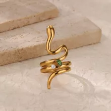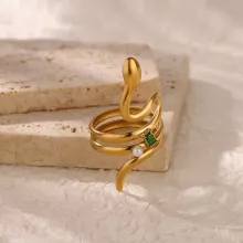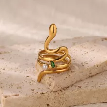 This ring stands out with its symbolic serpent shape—representing empowerment, renewal, and feminine strength. The combination of zircon sparkle and classic pearl softness creates a perfect balance between modern chic and timeless elegance. Its stainless steel structure ensures long-lasting shine, while the gold color adds warmth and luxury to any outfit.