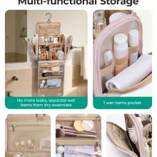 Dedicated leakproof PVC pockets keep wet items like toothbrushes or towels separate from dry essentials. Another heat-resistant pocket is perfect for beauty tools, while clear front pockets neatly store makeup brushes and pads. A top compartment keeps daily jewelry safe and easy to access.
