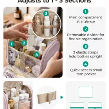 The spacious interior measures approximately 11 x 7 x 9 inches and opens wide so you can see everything at a glance. Adjustable, detachable dividers let you customize the main compartment into one, two, or three sections depending on what you’re packing. Elastic straps hold bottles upright to help prevent spills and leaks, making this bag ideal for shampoo, skincare, and full-size toiletries.