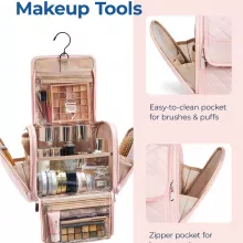 This makeup bag is designed with convenience in mind. Inside, elastic bands hold bottles upright to prevent spills, while clear zippered pockets let you see what you need at a glance. A smooth metal zipper glides effortlessly, and the sturdy top handle makes carrying simple. The 360-degree rotating metal hook allows you to hang the bag on doors, towel racks, or shower rods, saving counter space and keeping items clean and accessible.