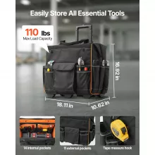 No more digging around for the right tool. This rolling tool bag features 25 well-placed pockets that make organization simple and efficient. With 14 interior pockets and 11 exterior compartments, every tool has its place. The bright orange interior lining improves visibility, so you can spot what you need in seconds, even in low-light conditions.