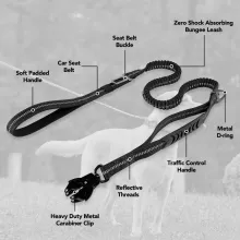 This tactical leash is engineered with a super-strong aviation aluminum Frog Clip that locks securely yet releases quickly when you need it. The clip rotates 360° to prevent tangles, making every walk smoother. It also includes two padded handles for versatile control: a soft padded handle at the end for relaxed walking, and a traffic handle closer to your dog for tight, controlled guidance in crowded or high-traffic areas. The shock-absorbing bungee design reduces strain by stretching naturally to ease pulling pressure. Reflective stitching adds safety at night, and the built-in seatbelt attachment keeps your pup secure during car rides.