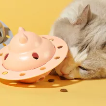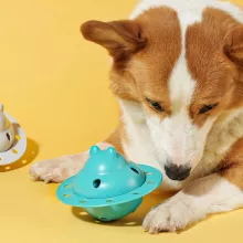 This interactive slow feeder toy is made from durable, non-toxic plastic that stands up to playful bites and paws. Shaped like a frisbee with a rolling ball center, it dispenses small treats or kibble as your pet nudges, rolls, or tosses it around. The puzzle design slows down eating, helping prevent bloating and indigestion. No batteries or electronics — just simple, safe, and stimulating fun.