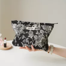 Keep your beauty essentials organized in style with this large capacity black floral cosmetic bag. Designed with a chic floral pattern and a sleek black finish, this bag is not only practical but also a fashionable accessory to carry with you. Whether at home or on the go, it ensures your makeup and toiletries are always within reach and neatly stored.