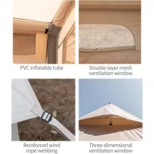 The tent is well-designed, offering a spacious interior without any wind issues. Initially, there is a slight smell from the materials, which I expect will fade after a few days. Although I inflated it slightly less than what the pressure gauge recommended out of caution, it's still very sturdy. I plan to buy a repair kit just in case, despite its high cost, because the convenience it offers is unparalleled.