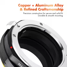 Crafted from durable brass and aluminum, the adapter provides a stable and precise connection between lens and camera. Its fully manual operation gives you complete control, making it ideal for photographers who enjoy adjusting focus and aperture by hand. Infinity focus is supported, allowing you to capture crisp, clear shots from vast distances. Because of its solid construction, the adapter is also a great match for heavier lenses. For larger telephoto or medium-format lenses, it works best paired with a tripod or telephoto bracket for perfect balance.