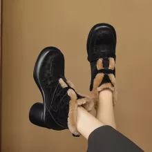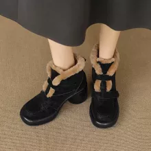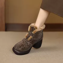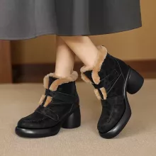 These boots feature a soft split leather upper with detailed sewing that adds a premium, handcrafted feel. Inside, a warm wool lining and wool insole help keep your feet comfortable during chilly weather. The round toe design offers enough space for natural movement, while the supportive platform and high round heel, measuring approximately 3 inches, provide a confident lift without sacrificing stability.