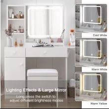 Equipped with an extra-large LED mirror featuring three adjustable light settings (warm, natural, and cold), our vanity desk ensures flawless makeup application at any time of day. The brightness can be customized with a simple long press, allowing you to perfect your look under ideal lighting conditions. Moreover, it boasts ample storage solutions including three open bookcases, three cubbies, two drawers, and a spacious cabinet with an adjustable shelf. The expansive countertop can be extended or folded to suit your spatial needs and style preferences.