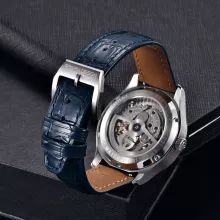 Built with ultra-tough sapphire glass and a brushed stainless steel case, this watch is designed to resist scratches, cracks, and daily wear. The transparent back cover showcases the intricate automatic movement, a reminder of the mechanical artistry inside. The stainless steel strap with a butterfly clasp ensures a secure, comfortable fit on your wrist, perfect for long days or evening events.