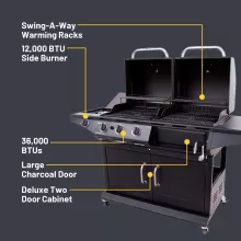 A Father's Day gift from my wife, and out of all the Gas/Charcoal Grills I've had, this one tops them all. Using both sides simultaneously, I bake potatoes on the gas side and grill steaks on the charcoal side. It's also excellent for smoking. I'm on the lookout for a compatible rotisserie.
