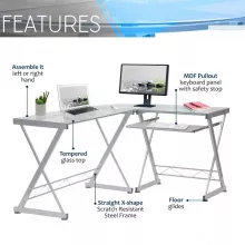 I couldn't be more pleased with this desk. The tempered glass surface is not only chic and modern, but it's also incredibly easy to clean, which is a big plus for me. The steel frame gives the desk a sturdy feel that reassures me of its durability - I don't have to worry about it wobbling or falling apart under the weight of my computer and other office essentials. The pull-out keyboard tray has been an absolute game-changer in terms of comfort and convenience during long working hours. It cleverly saves space on the desktop while providing an ergonomically friendly position for typing. Moreover, assembling this desk was surprisingly straightforward - no headaches at all! What impressed me further was how perfectly the L-shape fitted into my corner space, freeing up so much workspace that I previously didn’t know I had. In terms of aesthetics and functionality combined, this product has exceeded my expectations by far. It’s made a significant difference in both productivity levels as well as enhancing the overall look of my home office setup.